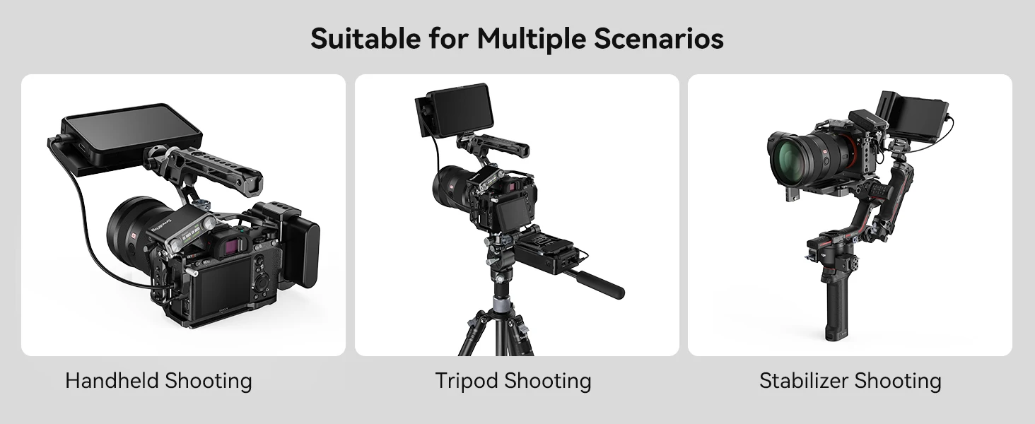 5. Multiple mounting points: 1/4"-20 threaded holes, ARRI 3/8" -16 locating holes, cold shoe mounts, NATO rails and QD socket support handles, microphones, LED lights, monitors, etc.