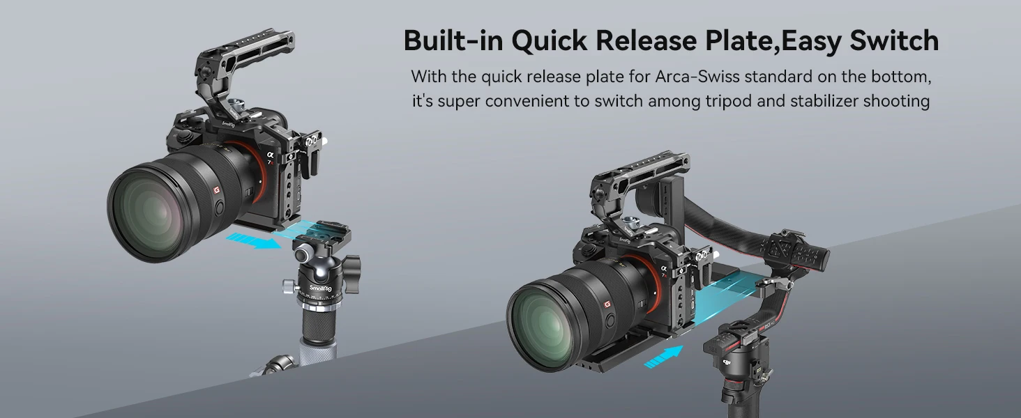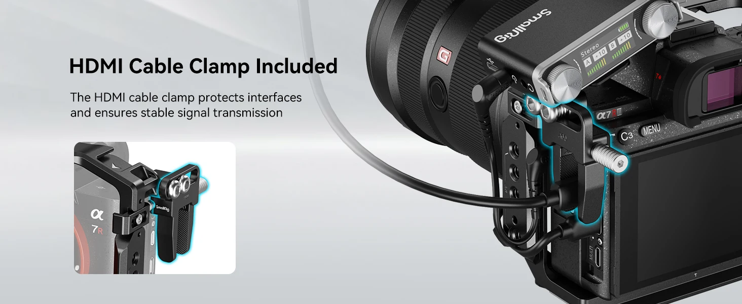 SmallRig Cage Kit for Sony Alpha 7 III / Alpha 7R III 4198 is designed to facilitate a low-angle shot and protect the camera while offering a wide range of accessory mounts. It includes a cage, an HDMI cable clamp, and a top handle. The top handle feels comfortable and enables easy carrying at a low-angle shot. 1/4"-20 threaded holes, ARRI 3/8" -16 locating holes, cold shoes and NATO rails and QD socket support monitor mount 2294, microphones, LED lights, monitor mount 2903B, NATO accessories. The HDMI cable clamp, mounted onto the left side of the cage via two 1/4"-20 screws, prevents deflection and fixes cables with a thumbscrew to protect interfaces and ensure stable signal transmission. In addition, holes on both sides of the cage allow for attaching hand straps. The cage comes with a built-in magnetic flat-head screwdriver & hex spanner for easy disassembly and assembly.