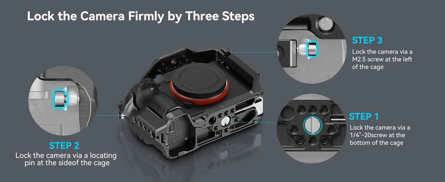 Note: Please remove the split D-ring on both sides of the camera before installing the cage.