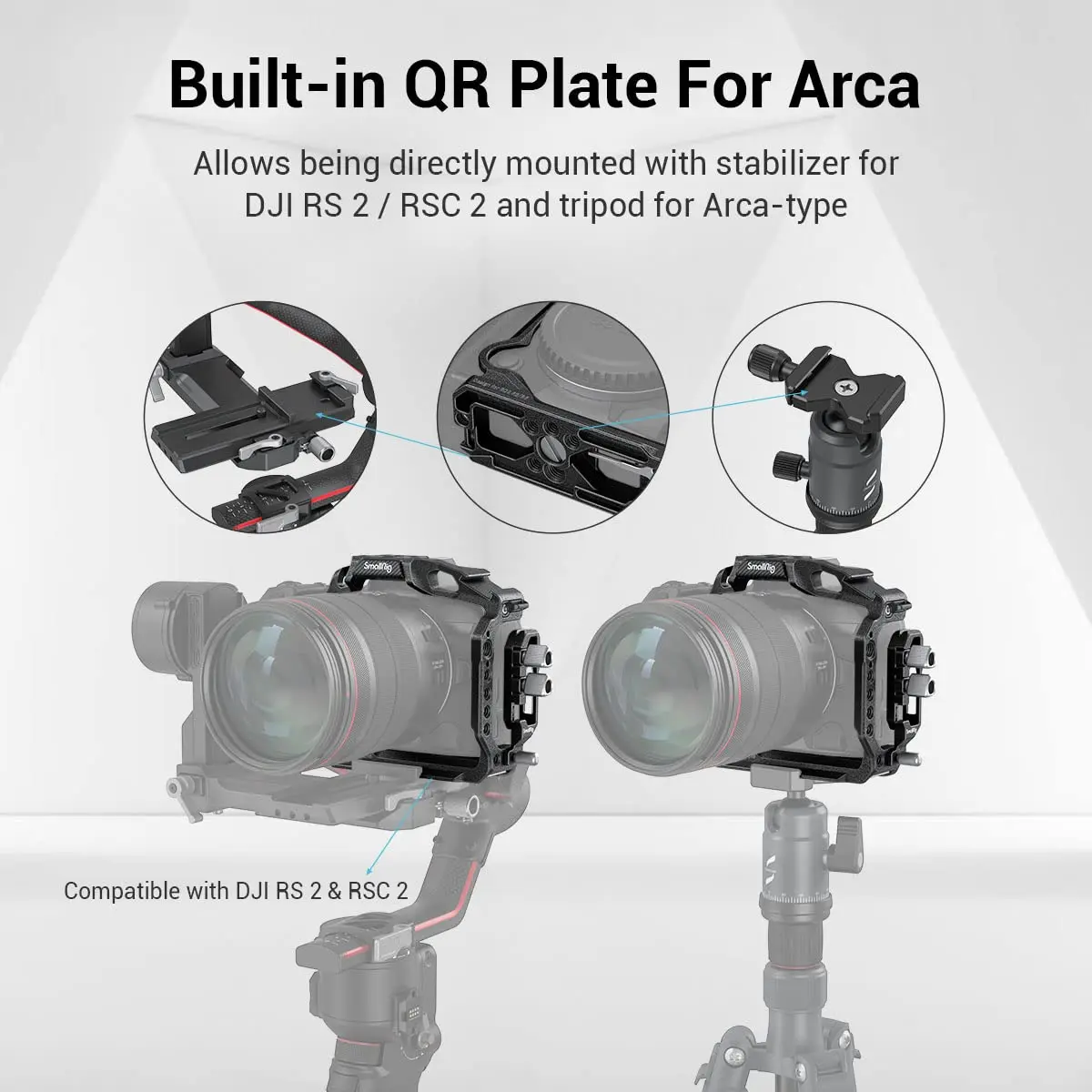 SmallRig “Black Mamba“ Camera Half Cage & Cable Clamp for Canon EOS R5&R5 C&R6 3656 is designed to leave the camera handgrip fully accessible and provide multiple accessory mounting points. The cage is locked with a 1/4" screw and a locating pin at the bottom and through the shoulder strap hole on the left side to prevent deflection. Silicone pads are built-in at several positions to protect the camera from scratches. The “Black Mamba” style is continued, maintaining full access to the camera's controls. the cage feature multiple 1/4"-20, ARRI 3/8" -16 locating holes, cold shoes mount to attach accessories like Side Handle 2093, Top Handle 1984, magic arm 2070, microphone, light, and hand strap PAC2456. Integrated Arca-Type base directly compatible with DJI RS 2 & RSC 2 Gimbal to realize quick switch among RS 2, tripod and handheld shooting, and Built-in spanner on the bottom helps remove screws. The attached hand-tight HDMI & USB-C cable clamp to prevent accidental disconnection and ensure stable signal;