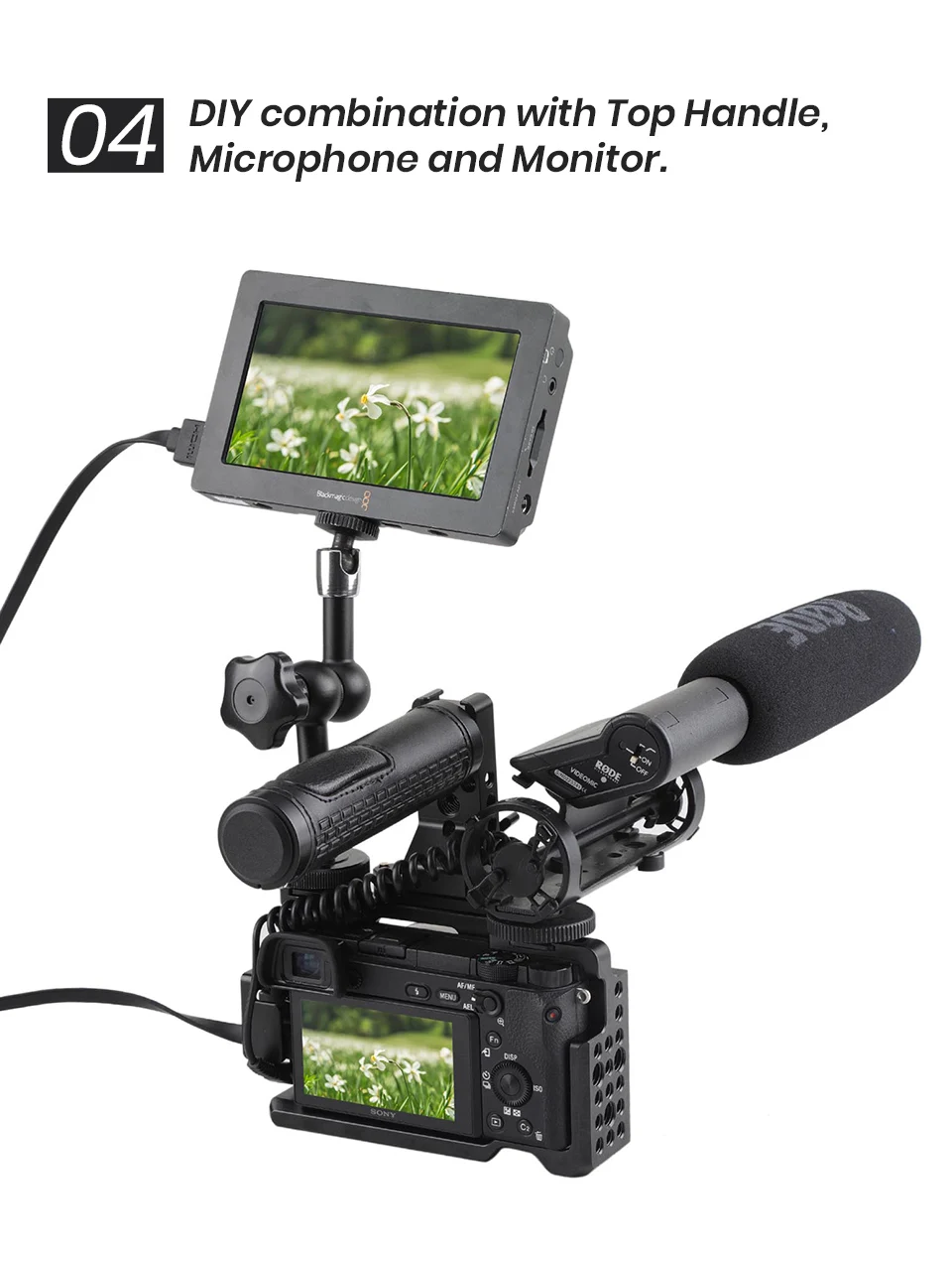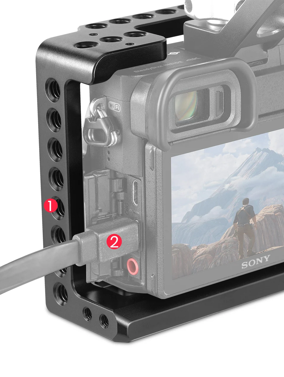 The built-in shoe mount is used to connect light accessories, such as a microphone, EVF mount and more. A 1/4’’-20 threaded hole at the front enables it to attach to 15mm Micro Rod with 1/4'' Thread 915 for follow focus. For a handheld shoot, adding a top handle is a good choice. This cage is also compatible for A6500 Wooden Handgrip 1970. It enables it to mount HDMI Cable Clamp 1822 to protect the HDMI port. Besides, you can purchase Metabones Lens Adapter Support 1787 to protect lens port due to the long and heavy lens pressure. The front of the cage is designed for anti-twisting and excellent heat dissipation, beneficial for a more enjoyable shoot.