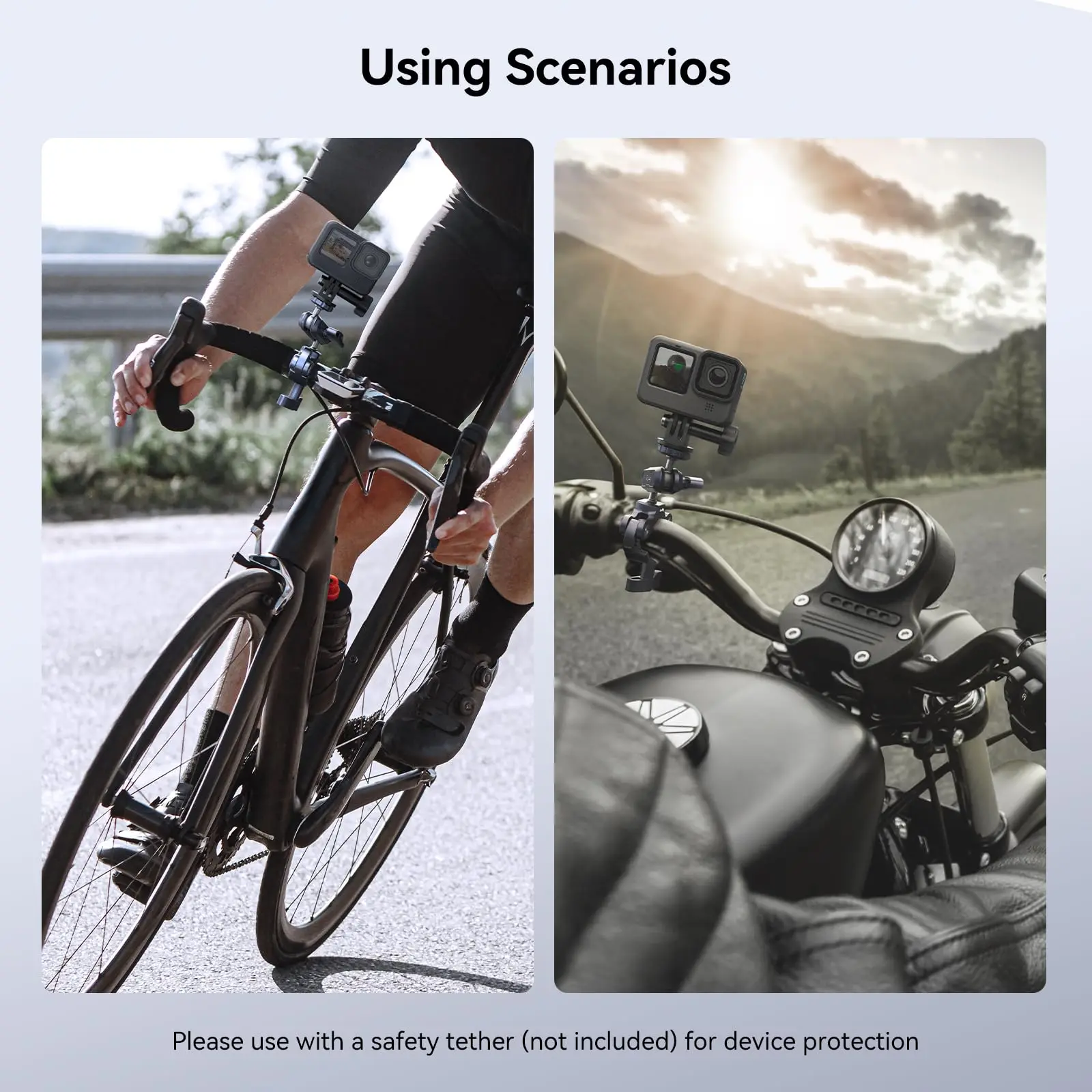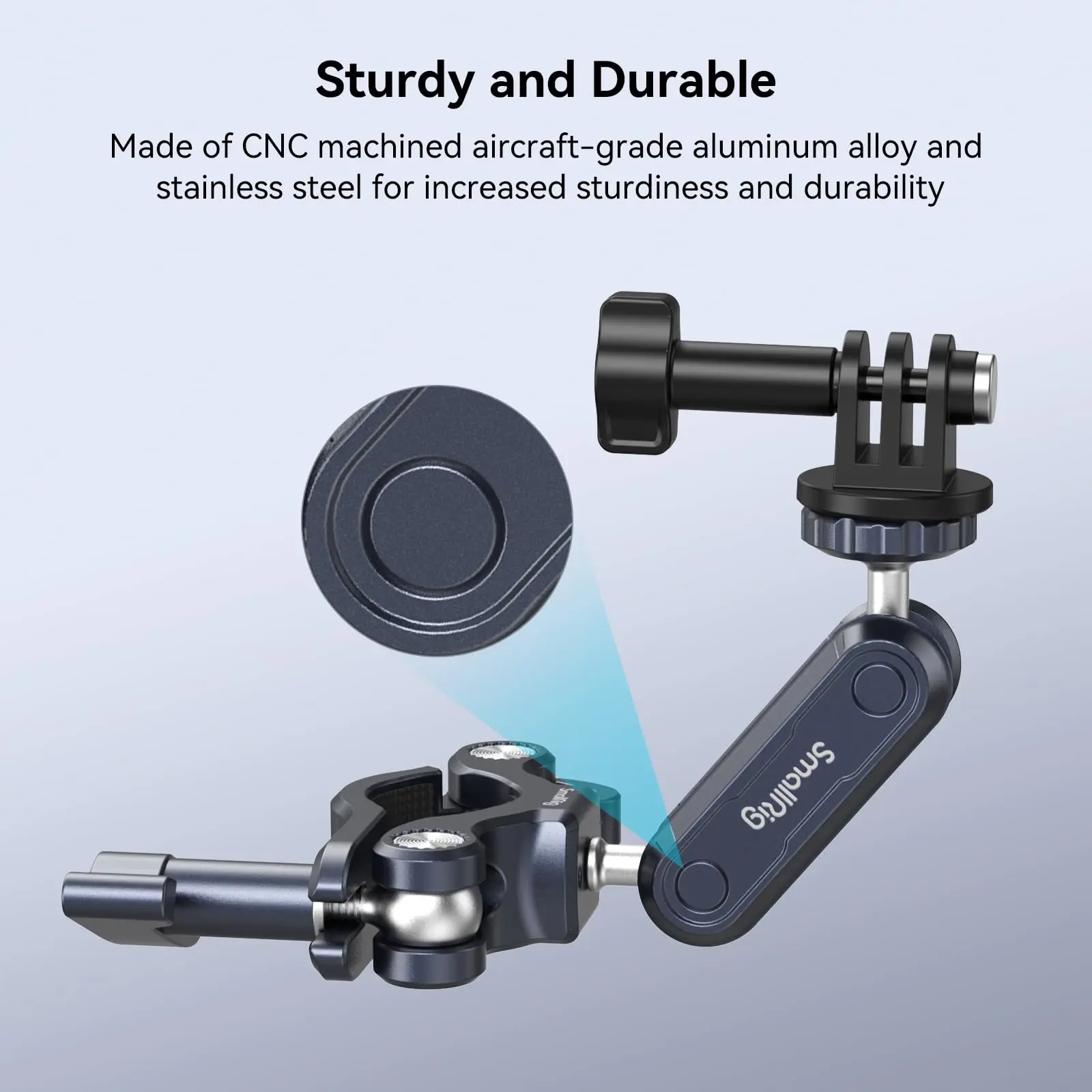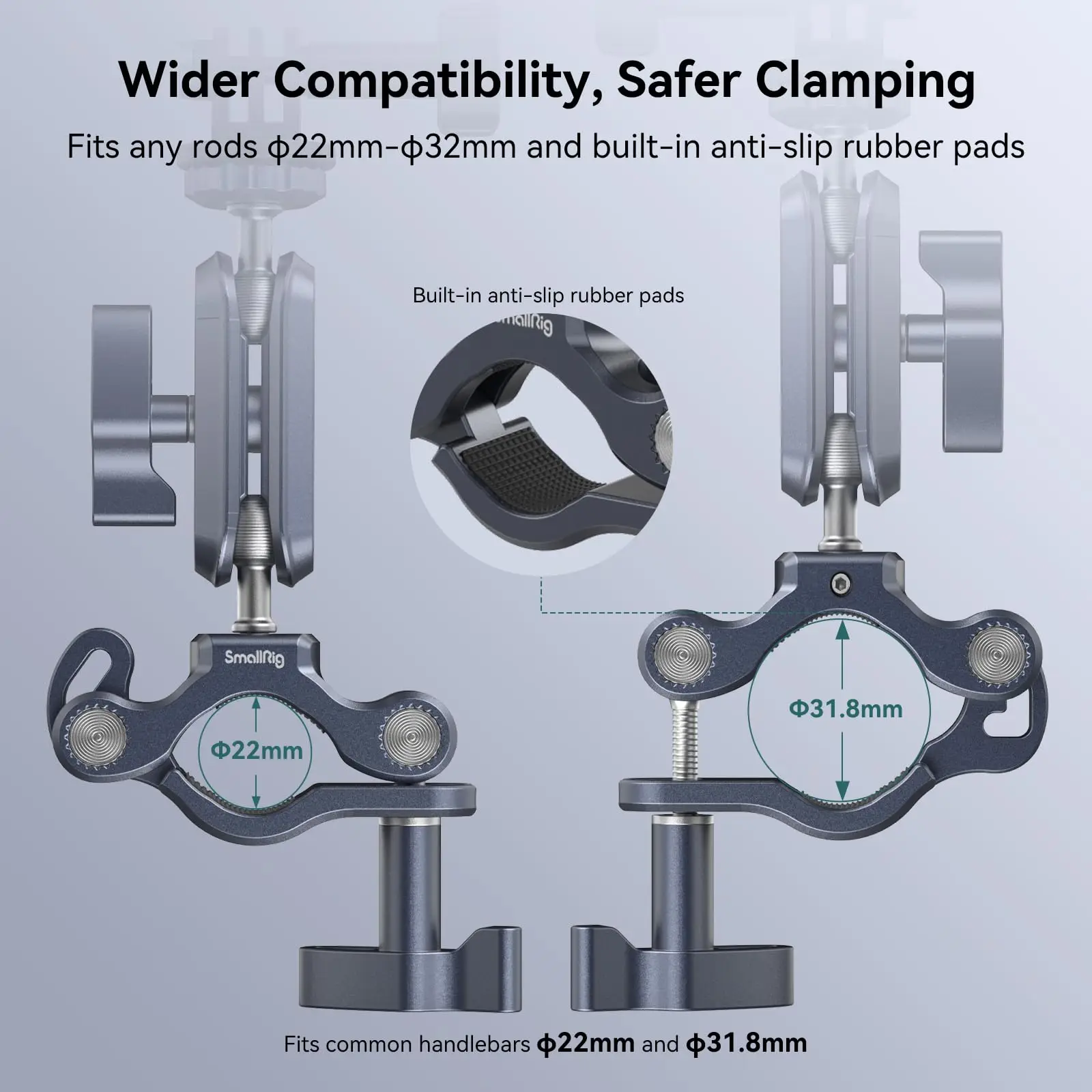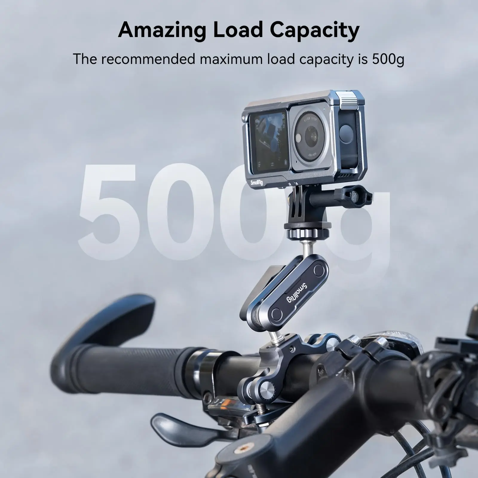 SmallRig Handlebar Mounting Clamp for Action Cameras 4191 comprises a handlebar clamp and an action camera mount. Made of CNC machined aircraft-grade aluminum alloy and stainless steel for more sturdiness and durability, this highly compatible item supports any rod 22mm-32mm in diameter and particularly comes with two clamping distances that best suit common ⌀22mm and ⌀31.8mm handlebar by simply adjusting the gear, in which cases, the area of contact is increased, securing and protecting your camera while you are biking. It also features protective rubber pads to prevent scratches and increase clamping stability. The ballhead magic arm, which consists of two ball heads and a ballhead clamp, is connected to the handlebar clamp via an anti-twist and anti-off machine screw. Its 360-degree adjustable ball heads feature ring textures to help lock them down and prevent movement. There is on the bottom a hex hole for enhanced fastening with an Allen wrench and on the top one 1/4"-20 screw to allow attaching GoPro, insta360 X3, DJI Action3, AKASO, etc.