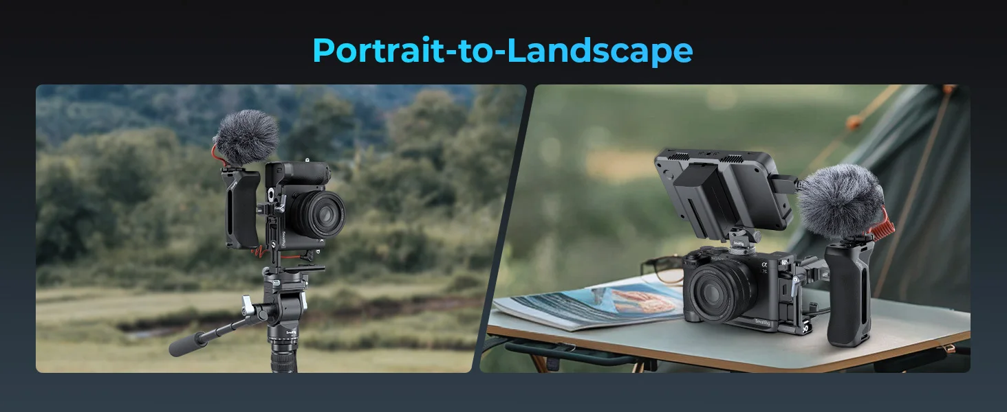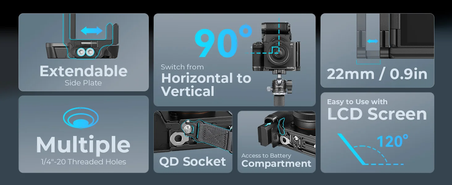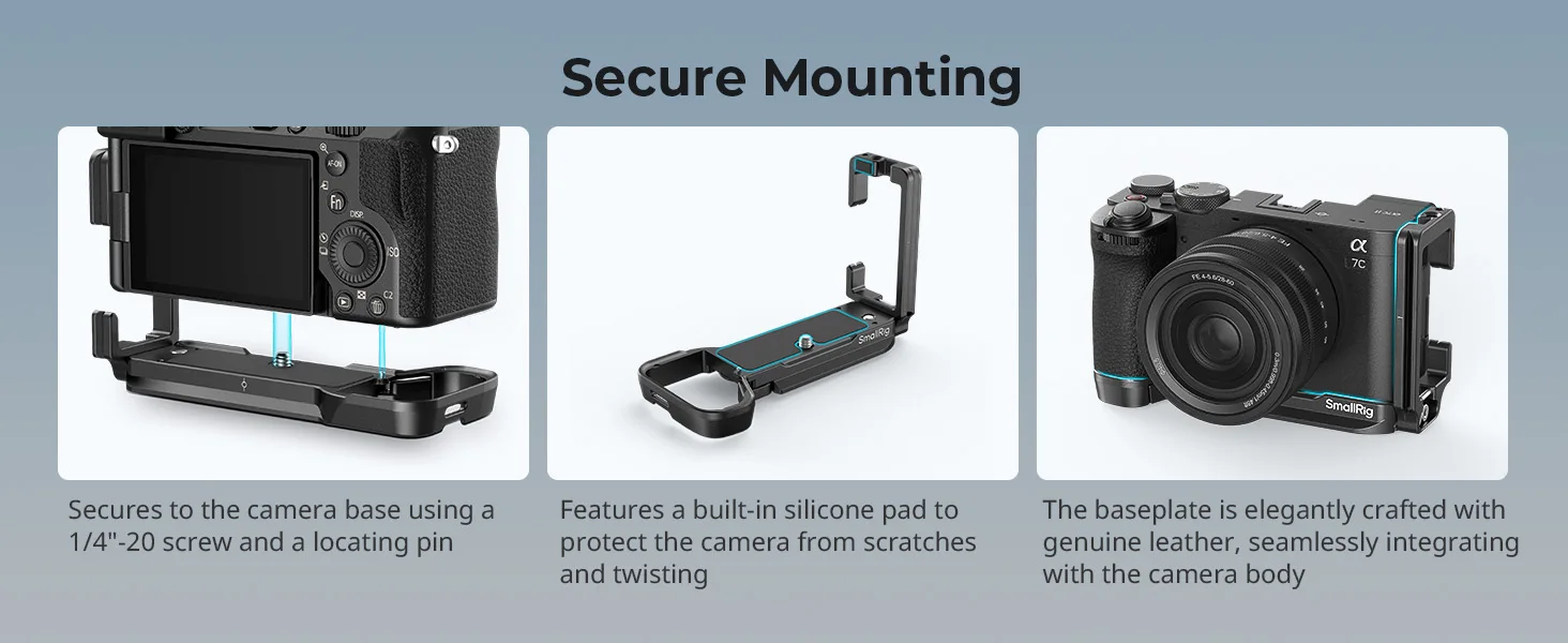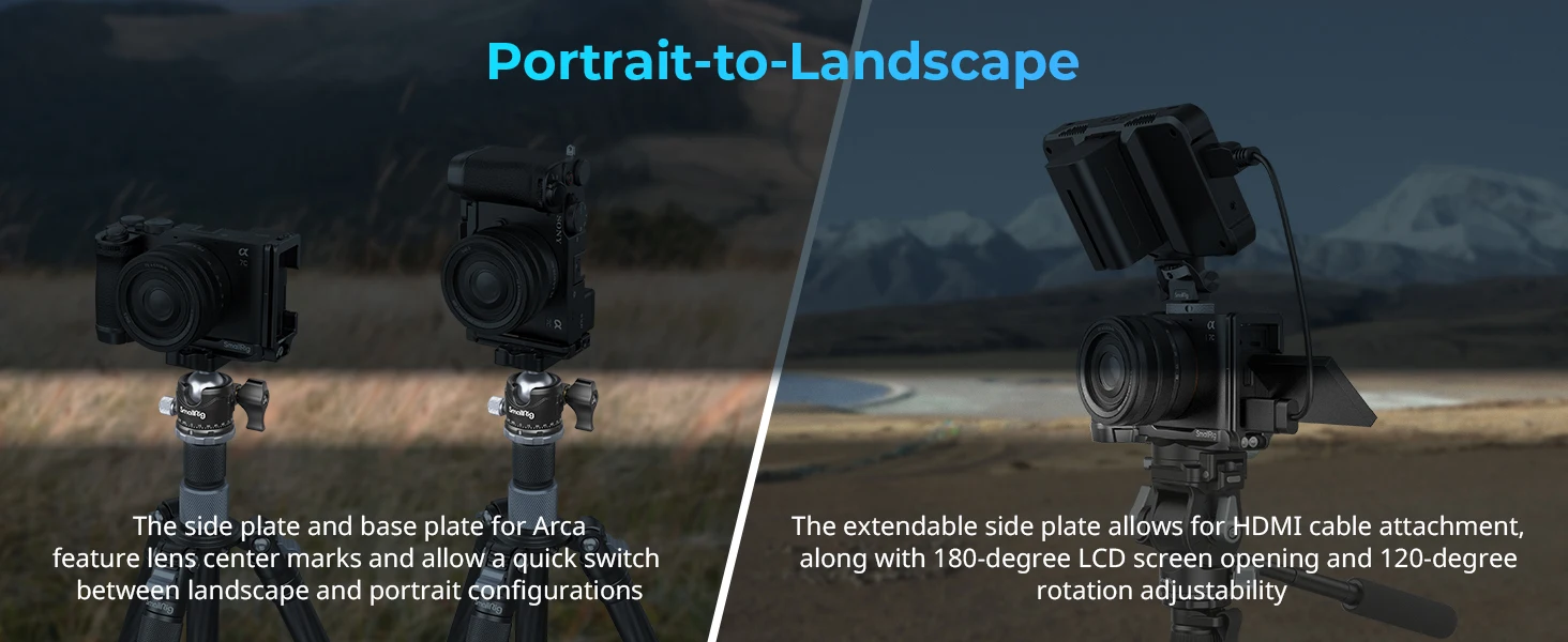 SmallRig L-Bracket for Sony Alpha 7C II / Alpha 7CR 4569 enables quick switch between horizontal and vertical shots while improving grip experience. It attaches to the bottom of the camera via a 1/4" -20 screw and locating pin, with features built-in silicone pad to prevent scratches and twisting. There is a spindle spanner at the battery door which fits camera curve and leave room for little finger for comfortable grip. Embedded select genuine leather in the baseplate integrates into camera body; Arca compatible baseplate and side plates come with lens center mark. The side plate is extendable to allow attaching HDMI cables and adjusted back and forth to facilitate 180-degree opening and 120-degree rotation of the LCD screen. Multiple 1/4"-20 threaded holes at the bottom support quick release plates, tripods and the quick release plate (pad) of DJI RS 2 / RSC 2 / RS 3 / RS 3 Pro stabilizer. In addition, there is a shoulder strap hole in the lower left corner, which can be used with the shoulder strap hook in the upper right corner of the camera to realize diagonal mounting of the shoulder strap for LCD screen viewing; the lens is facing down when diagonally mounting the shoulder strap, which effectively reduces bumping. Built-in Flat-head Screwdriver for easy disassembly and assembly.