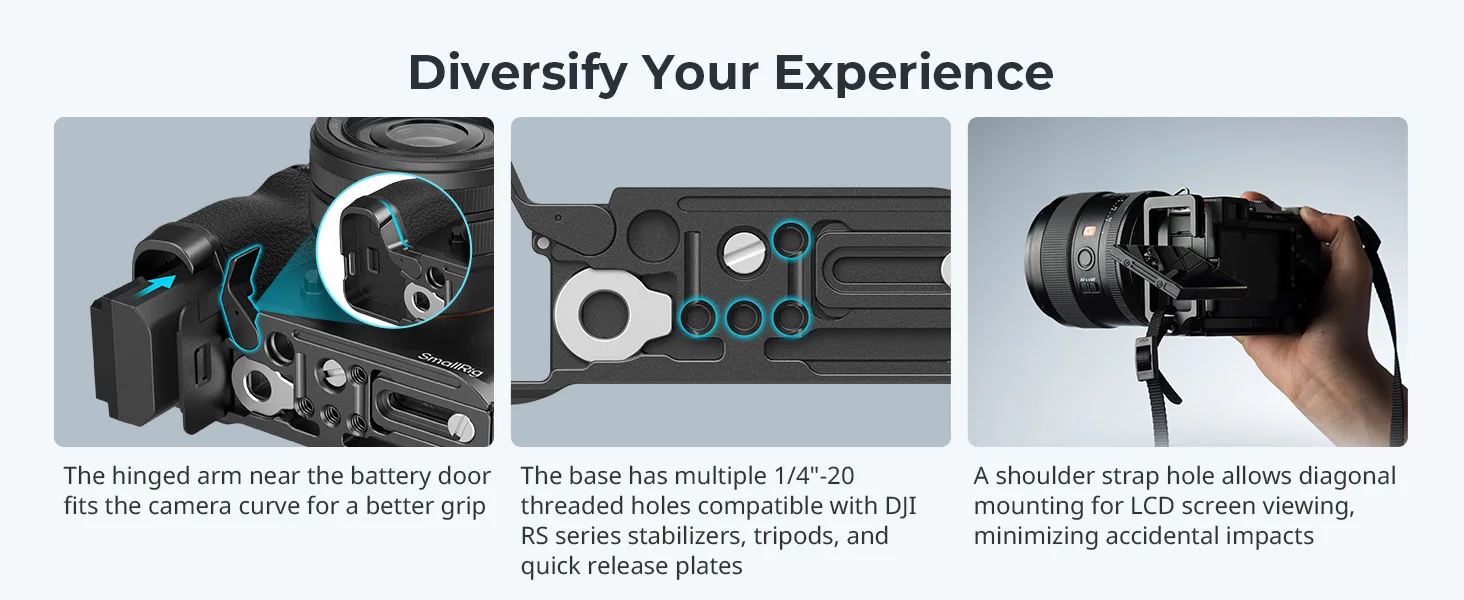 2.Hinged Arm at the battery door fits camera curve and enhances grip experience