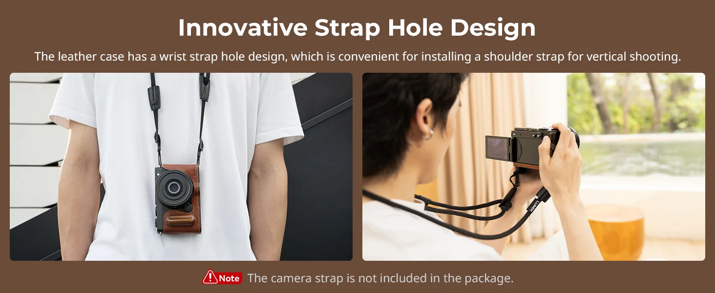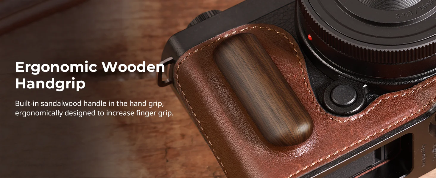 SmallRig Leather Half Case for Panasonic LUMIX S9 4703 is designed to protect the camera while enhancing its vintage charm and grip. Built-in wooden grip for increased finger gripping strength.The durable and breathable top-grain leather material of the half case enriches the camera's retro aesthetics and feel, while its suede lining ensures protection against scratches. With a built-in 1/4”-20 thumb screw at the base, the case attaches directly to the camera without extra tools. The case allows unobstructed access to key camera features like the battery compartment, LCD screen, card slot, etc. The integrated aerospace-grade aluminum frame ensures a snug fit and provides impact protection. The bottom features a 1/4”-20 threaded hole, enabling direct tripod mounting without removing the half case.