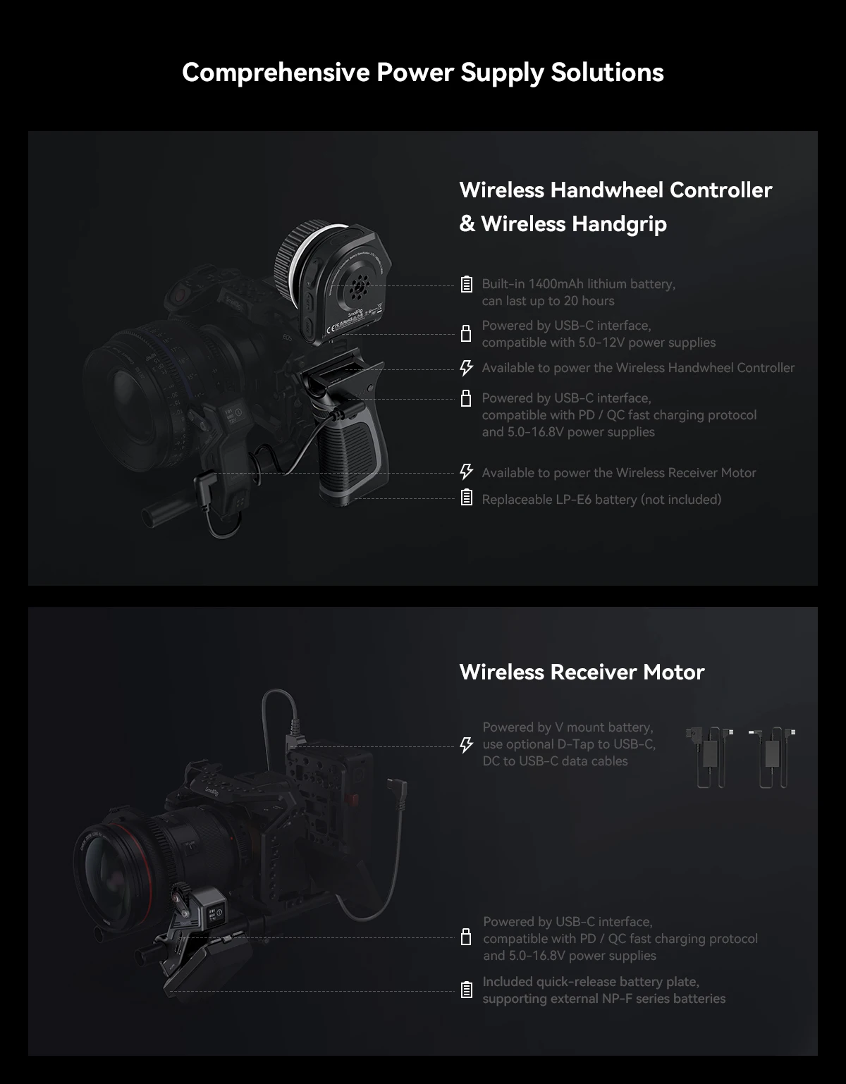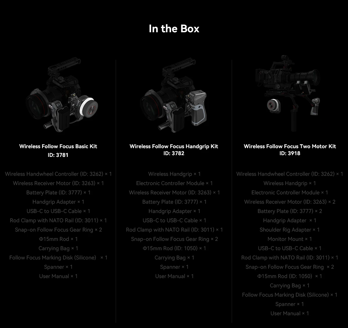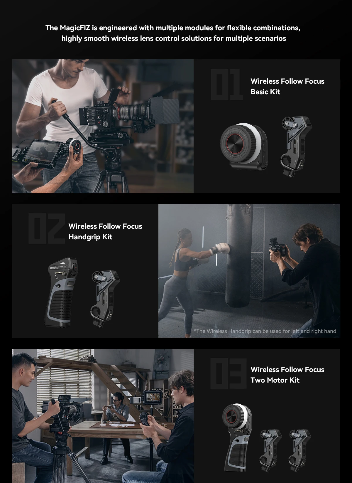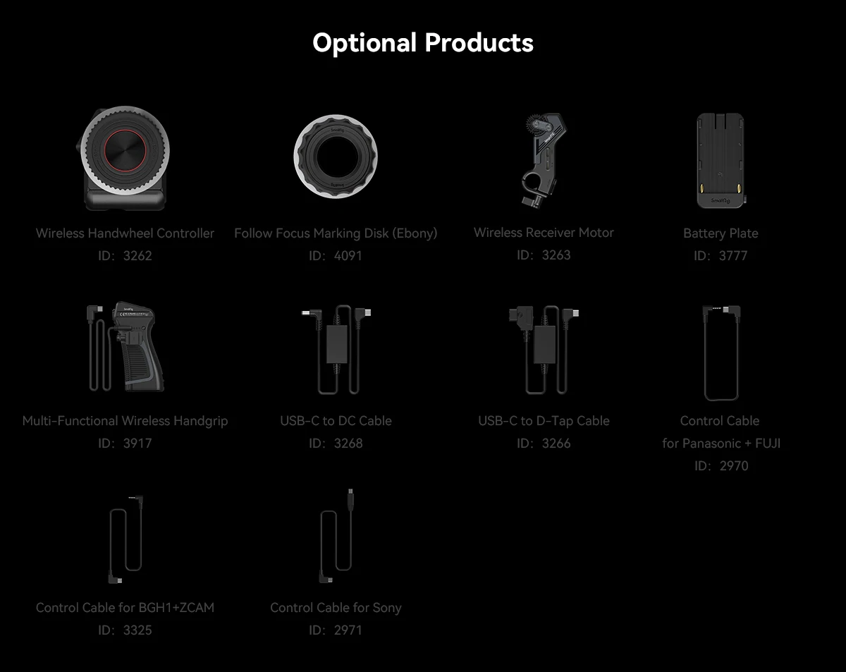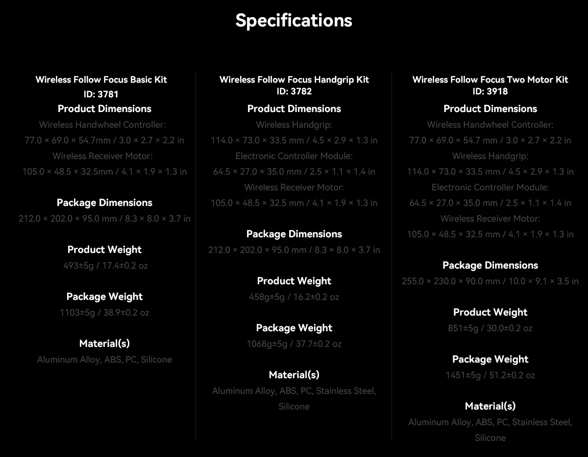 SmallRig MagicFIZ Wireless Follow Focus Two Motor Kit 3918 is designed to provide single photographer or photography team with precise follow focus solutions in hand-held, over-the-shoulder shooting and monitoring. The Wireless Handwheel Controller has a 1400mAh battery and lasts up to 40 hours when working with Wireless Handgrip. It, alongside electronic control module, comes with power-failure memory function that spares you from repeated lens calibration and AB point settings, thus improving shooting efficiency. Ultra-low-power 0.96" OLED screen with RGB lighting effect and vibration warning provides a simple but efficient interaction experience. Wireless Handgrip (ID: 3780) not only fits Wireless Handwheel Controller (ID:3262) well for dual control of Wireless Receiver Motor but works with electronic control module for single-channel wireless and cabled control of Wireless Receiver Motor. The Wireless Receiver Motor supports fast charging and provides 9V/18W and 0.5N.m torque output. It can be powered by Battery Plate (ID: 3777) with NP-F batteries or by USB-C to D-Tap Cable (ID: 3266) and USB-C to DC cable (ID: 3268) with V-Mount batteries. The whole system has a remote control range of up to 100m in open area and also supports lower-latency control with Wireless Handgrip 3780 and USB-C cables for more stability. Its BLE module helps in wireless REC start/stop which can also be realized by control cables (ID: 3325, 2971, 2970, depending on your camera type) with Wireless Receiver Motor. The Two Motor Kit also includes shoulder rig adapter, handgrip adapter and monitor adapter (ID: 4092) for hand-held, over-the-shoulder shooting and monitoring. With freely switchable modular, the wireless follow focus system brings you quick release and precise, stable focus experience for handheld, head, tripod shooting and director monitoring.