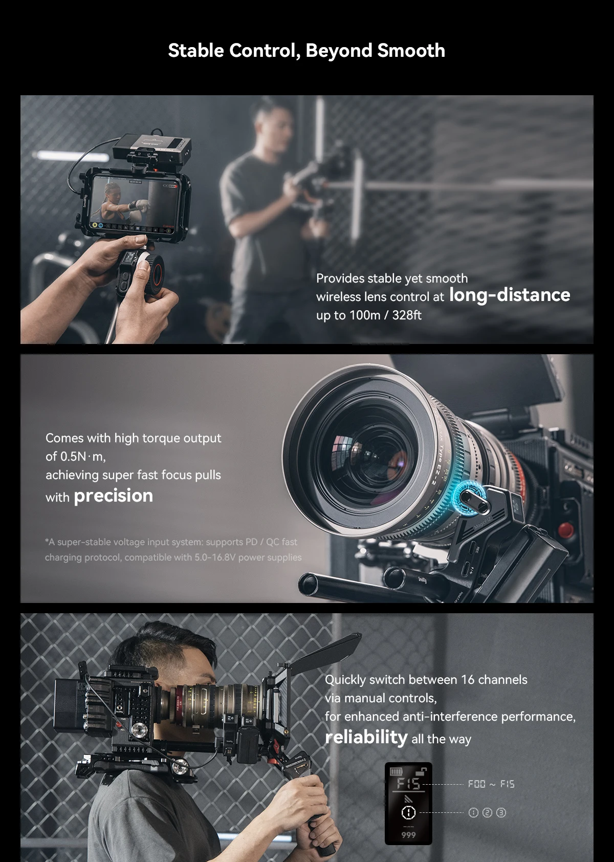 3. High precision BLDC control algorithm + anti-interference encryption algorithm for precise, stable follow focus