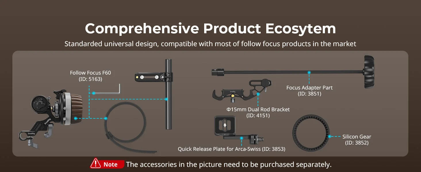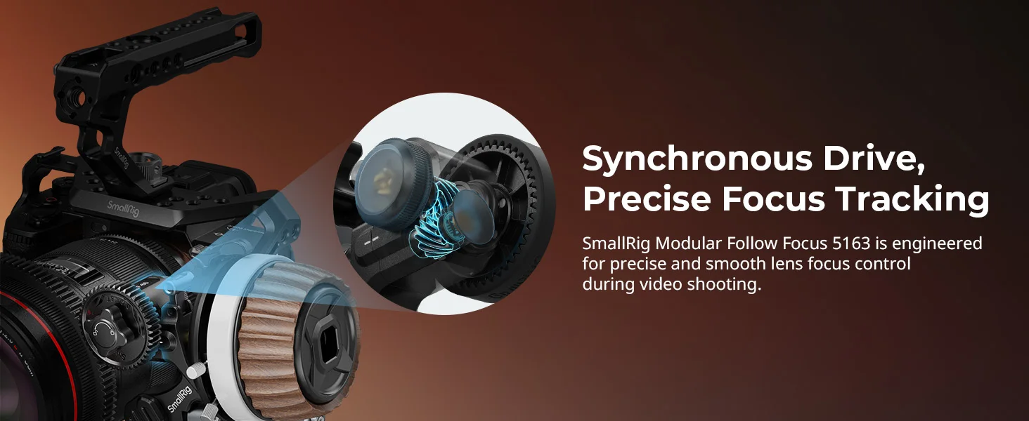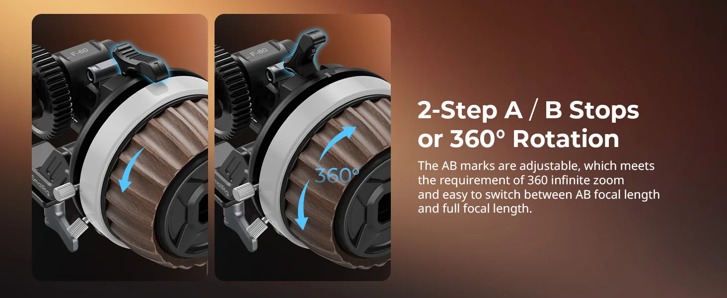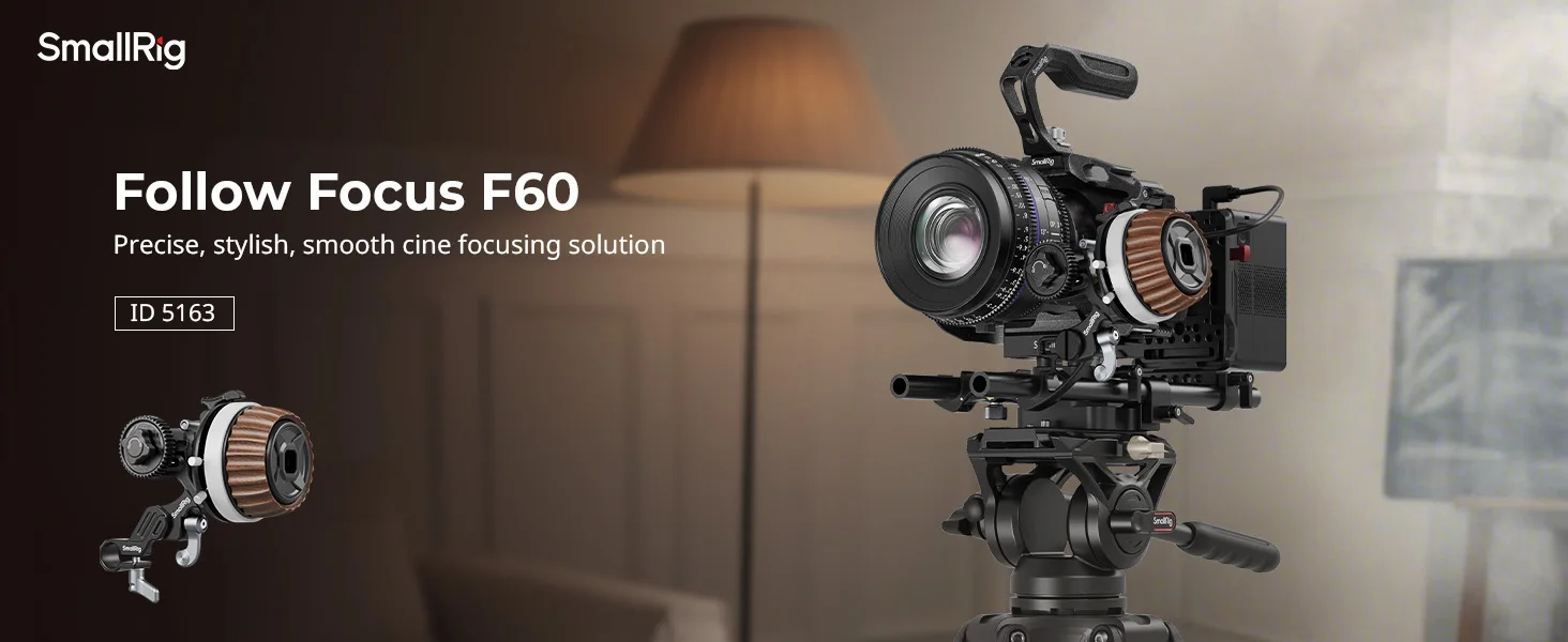 SmallRig Modular Follow Focus F60 5163 is engineered for precise and smooth lens focus control during video shooting. Notably, its optimized core drive mechanism ensures zero-backlash focus tracking for exceptional accuracy. The innovative stepless damping adjustment allows dynamic damping control within a range of 0.6kgf-1.8kgf, catering to users' preferences for different lens damping levels. It also supports 3-step quick lens reversal switching and 2-step A / B stops setting and release, along with 360° quick push-pull zoom. This modular follow focus includes a silicon gear (ID: 3852) that directly drives focusing on mirroless camera lenses through friction. Redesigned for a refined appearance, it offers improved damping adjustment and a wider range of focus angles, significantly enhancing the overall user experience.
