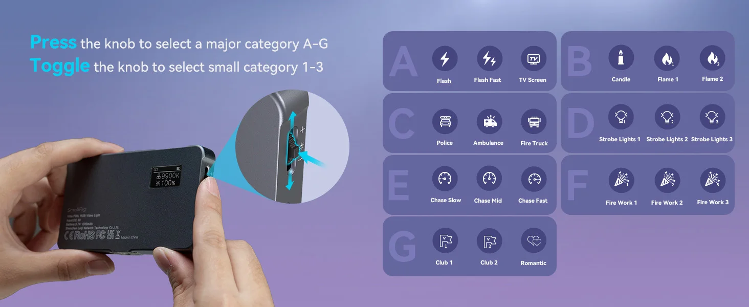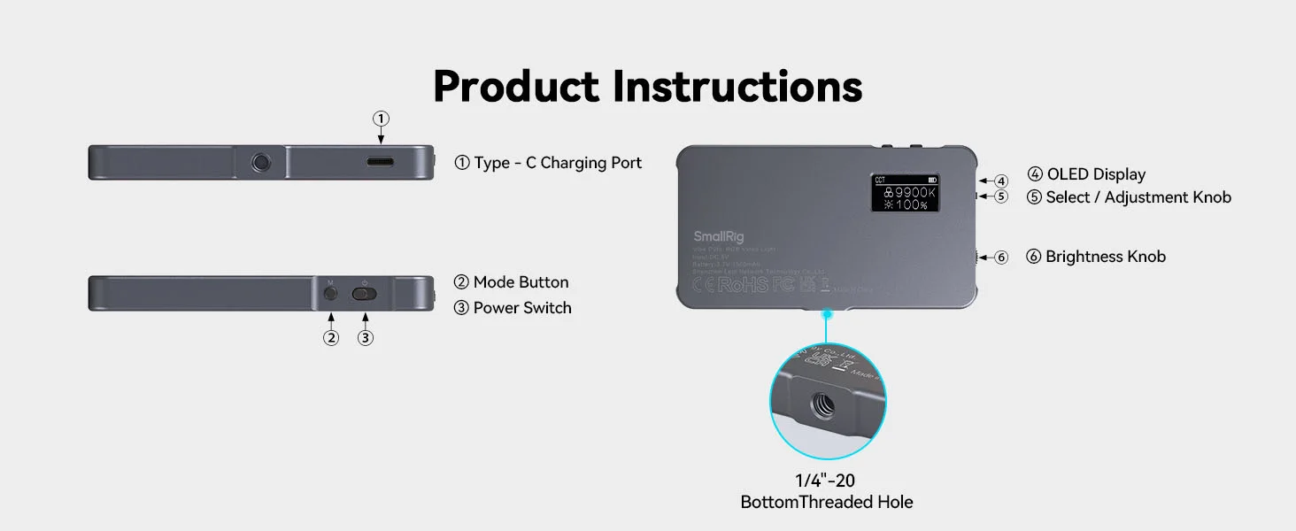 SmallRig Vibe P96L RGB Video Light is a portable mini fill light. The full aluminum alloy body, efficient heat dissipation performance and high-quality lamp beads provide a guarantee for the long life of the product use. All-in-one design, the perfect addition to the product's value. The thickness of the fill light is only 11mm, to meet the requirements of your carry-on, take anywhere. He has a color phase 0 degrees - 360 degrees adjustable; brightness from 1% - 100% adjustable; color temperature from 2500K (warm) to 8000K (cool) adjustable. LED camera light built-in LCD display, accurate readings, so you work more efficiently. At the same time 21 kinds of scene modes, so you can freely switch, easily create a variety of atmosphere.