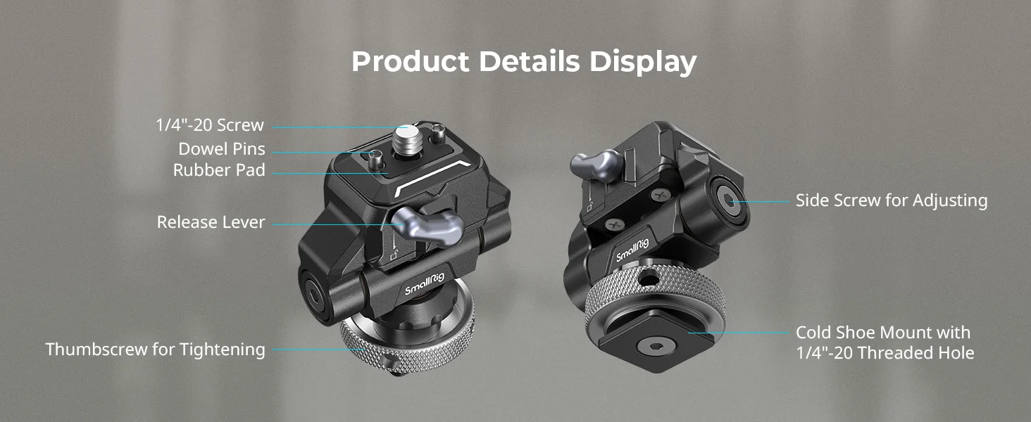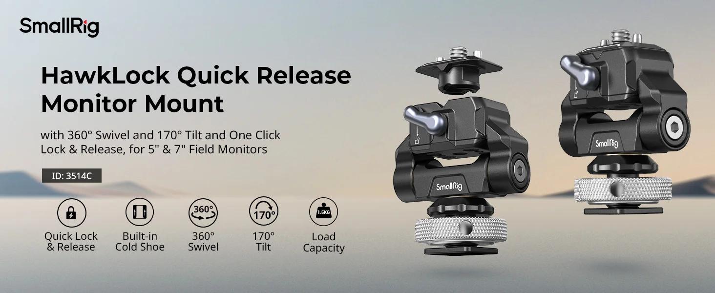 SmallRig Swivel Monitor Mount 3514C locks into place via a cold shoe at one end and attaches to a monitor via a unique SmallRig quick release plate at the other end, and the quick release plate is reserved for 2 optional dowel pins, which can be removed and installed as needed to effectively prevent the devices from deflection. This quick release plate allows for quick and easy vertical disassembly and installation of the monitor. 3514B swivels 360° and tilts 170°, and thus stops at any angle. 3514B has a dynamic load capacity of 1.5kg and its damping of pivot is adjustable through spanner. Features silicone pads on the top to prevent scratches and increase friction.