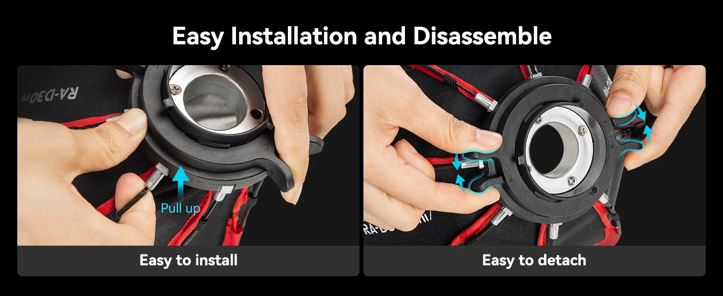 · Quick Release Design: With the new generation of self-developed quick-release patented designs, opening and folding a softbox is just one click away. Lift the opposite rods to set it up and click the quick release buttons to fold it back.