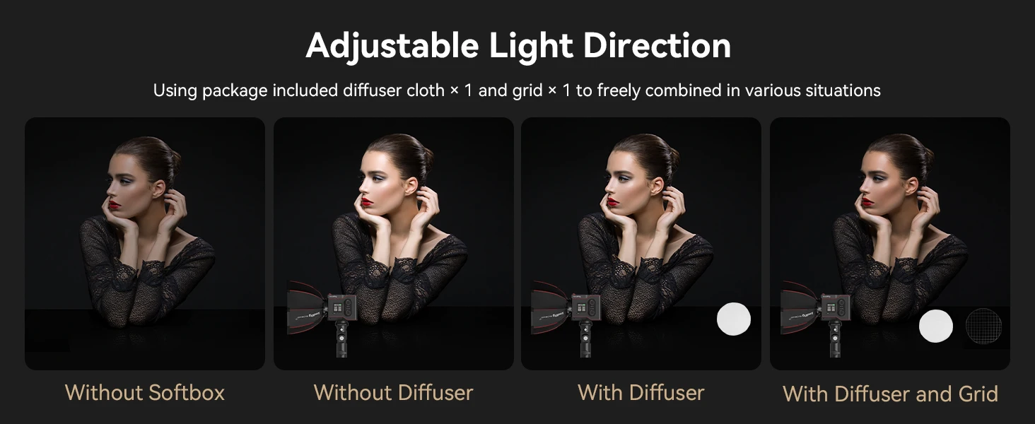 · Multifunctional Accessories:The honeycomb grid for better light control narrows the beam to 45°. Industrial-grade light diffuser material, high-reflective coating, and diffuser cloth to obtain the best soft light effect to meet your needs.
