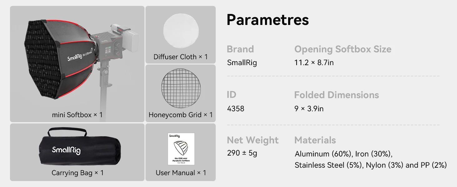 · Compatibility with RC 60B COB Light:The mini parabolic softbox is only compatible with RC 60B COB light. Recommended purchases with related products: SmallRig RC 60B COB Light (ID: 4376), 100W PD Charger for RC 60B (ID: 4315).