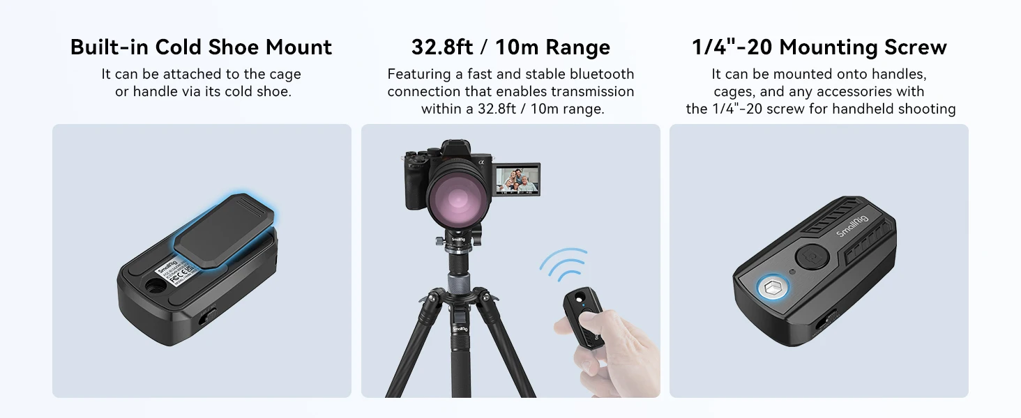 SmallRig Wireless Remote Controller for Select Sony / Canon / Nikon Cameras 3902 is designed for wireless control of camera shutter and recording. It easily triggers shutter and recording from a distance without causing any shake, thereby improving shooting. In STILL mode, press the button halfway for automatic focus and all the way down for taking pictures; In MOVIE mode, do a full press to turn on/off recording. This item comes with a detachable cold shoe clamp at the bottom to quickly mount to a cold shoe mount or your collar. Remove the clamp and it can be locked to such accessories as Side Handle 3260, Top Handle 2165C, etc. via the 1/4"-20 screw in the box. Its silicone bottom helps prevent deflection, while the screw features an anti-lost design. Once paired with camera, it can automatically connect to your device for saving time. Besides, the Bluetooth connection works fast and reliably within a radius of 10 meters.