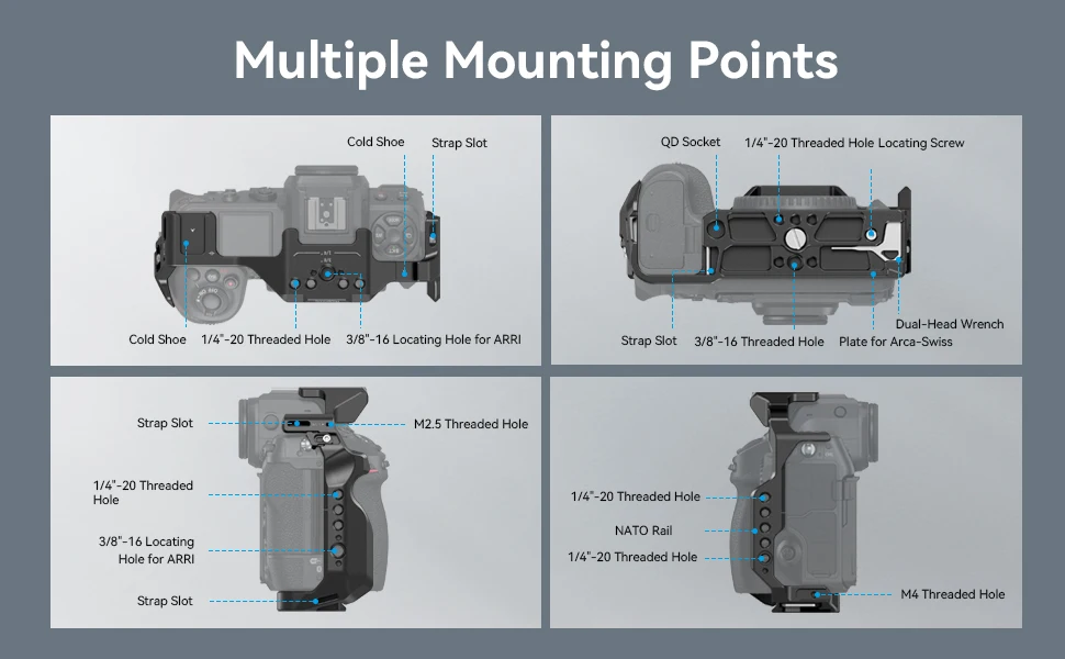 · Versatile Mounting Options: Multiple mounting points including threaded holes, locating holes, NATO rail, and cold shoe mount for enhanced expandability.